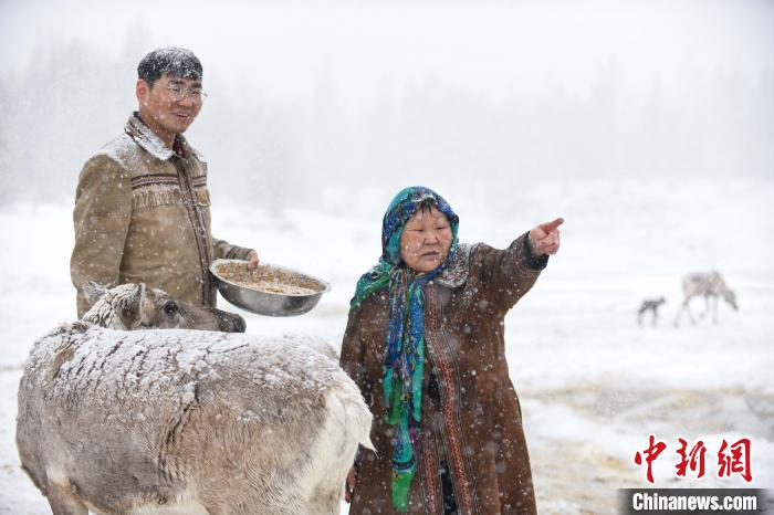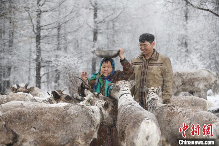 資料圖。圖為(wei) 2023年4月29日,在內(nei) 蒙古大興(xing) 安嶺,柳霞與(yu) 兒(er) 子雨果在雪中給馴鹿喂食豆餅。 王偉(wei) 攝