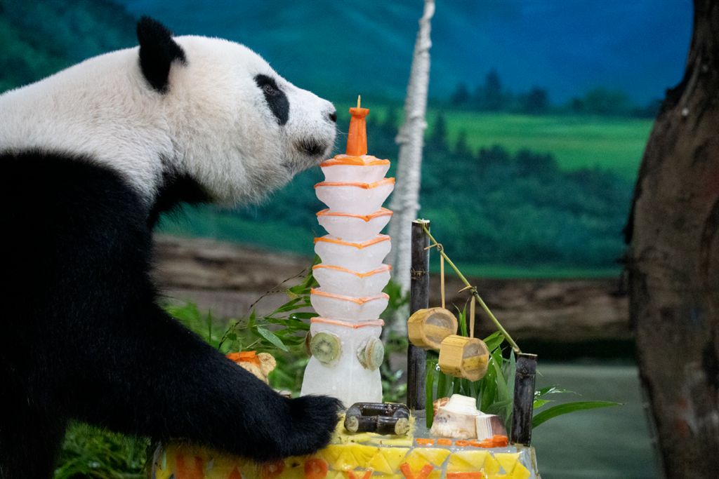 “圓仔”享用保育員準備的特製“蛋糕”,喜迎10歲生日。(台北動物園提供/中時新聞網)