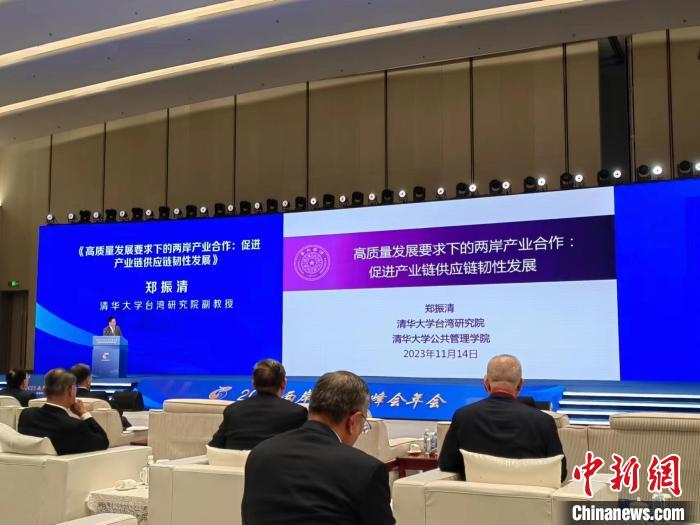 11月14日,清華大學公共管理學院、台灣研究院副教授鄭振清在兩(liang) 岸企業(ye) 家峰會(hui) 10周年年會(hui) 上作主題演講。(受訪者供圖)
