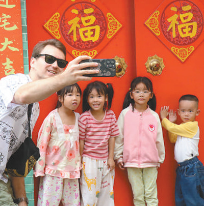 10月14日,在福建省福安市下白石鎮下岐村,撒普爾(左一)與(yu) 孩子們(men) 合影。
