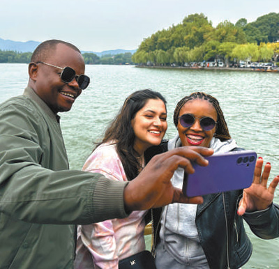 10月13日,代表團成員在浙江省杭州市西湖景區合影留念。