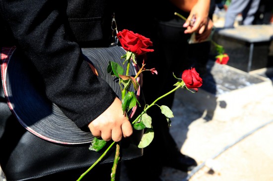 10月14日,黎巴嫩南部希亞(ya) 姆鎮,黎巴嫩記者手持玫瑰為(wei) 在以色列轟炸中死亡的攝影記者伊薩姆·阿卜杜拉送葬。新華社發(阿裏·哈希紹攝)