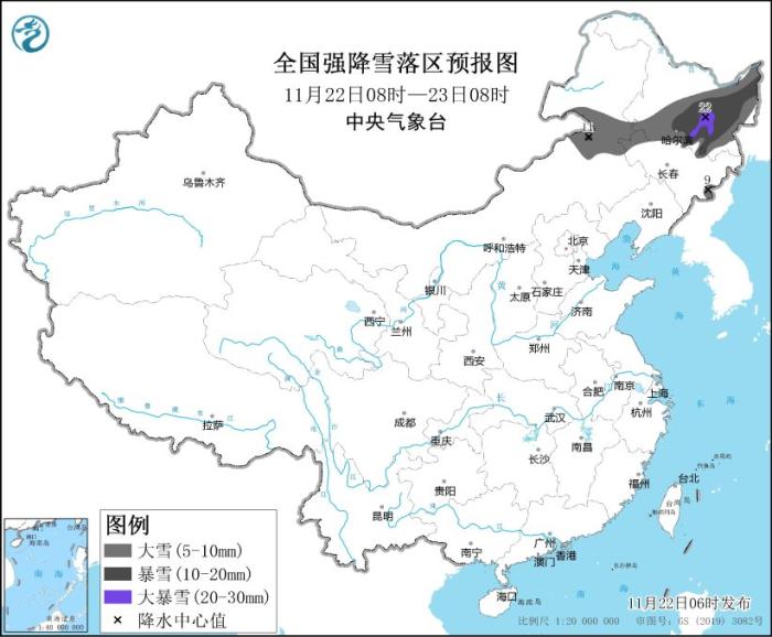 暴雪黃色預警:預計,11月22日08時至11月23日08時,內(nei) 蒙古東(dong) 部、黑龍江中東(dong) 部、吉林北部和長白山區等地的部分地區有大到暴雪,其中,黑龍江中部局地有大暴雪(20~22毫米);上述地區新增積雪深度6~12厘米,局地可達16厘米以上。