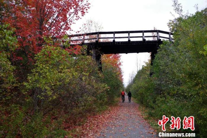 加拿大大多倫(lun) 多地區以東(dong) 的卡沃薩湖市(Kawartha Lakes),市民在一條充滿秋意的棧道騎行休閑。餘(yu) 瑞冬 攝