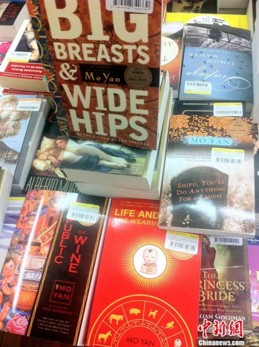 2012年10月21日,莫言的《豐(feng) 乳肥臀》《酒國》等多部作品英文版正在紐約一家書(shu) 店上架出售,每本書(shu) 的封麵都印有“2012年諾貝爾文學獎獲得者”字樣。李洋 攝