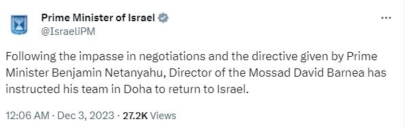 聲明稱,“談判陷入僵局後,經(以色列)總理內(nei) 塔尼亞(ya) 胡指示,(以色列情報機構)摩薩德負責人大衛·巴尼亞(ya) 命令其在多哈的團隊返回以色列。”