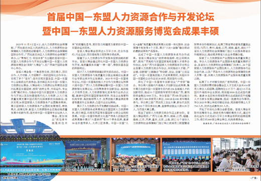 2023年11月3日至4日,由人力資源和社會(hui) 保障部、廣西壯族自治區人民政府主辦,人力資源和社會(hui) 保障部人力資源流動管理司、人力資源和社會(hui) 保障部國際合作司、廣西壯族自治區人力資源和社會(hui) 保障廳承辦,以“聚智匯力 同創共享”為(wei) 主題的首屆中國—東(dong) 盟人力資源合作與(yu) 開發論壇暨中國—東(dong) 盟人力資源服務博覽會(hui) (簡稱“人博會(hui) ”),在廣西南寧國際會(hui) 展中心舉(ju) 辦。