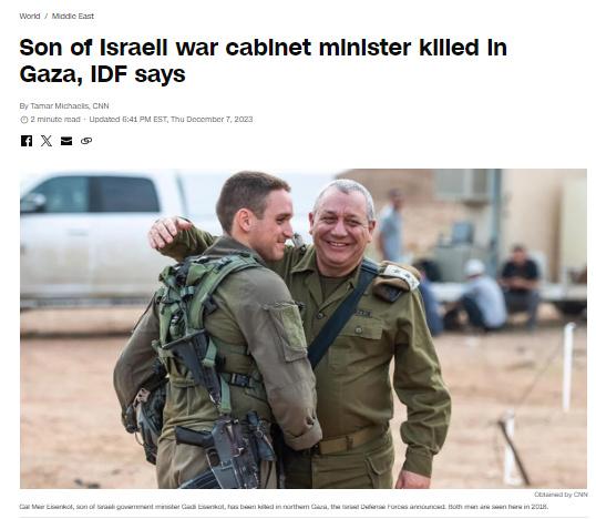 中新網12月8日電 綜合外媒報道,當地時間7日,以色列國防軍(jun) 表示,以色列內(nei) 閣部長、前國防軍(jun) 參謀長加迪·埃曾科特的兒(er) 子在加沙地帶北部的戰鬥中喪(sang) 生。