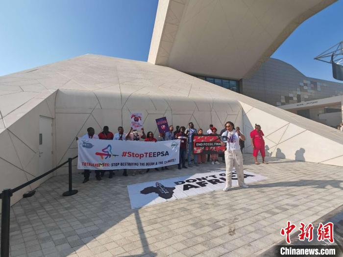 12月10日,阿聯酋迪拜,來自非洲的抗議者在COP28期間呼籲保護海洋環境、應對氣候變化,反對在非洲使用化石燃料。 中新社記者 龐無忌 攝