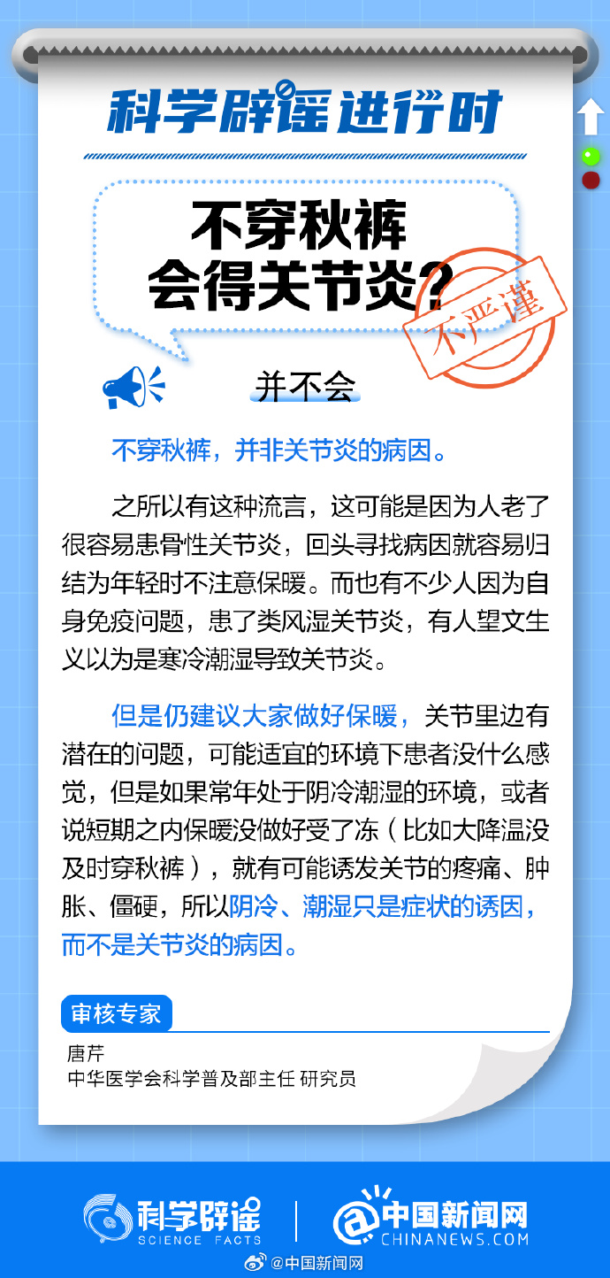 中新網12月11日電 不穿秋褲,並非關(guan) 節炎的病因。之所以有這種流言,這可能是因為(wei) 人老了很容易患骨性關(guan) 節炎,回頭尋找病因就容易歸結為(wei) 年輕時不注意保暖。而也有不少人因為(wei) 自身免疫問題,患了類風濕關(guan) 節炎,有人望文生義(yi) 以為(wei) 是寒冷潮濕導致關(guan) 節炎。但陰冷、潮濕是疼痛、僵硬等關(guan) 節炎症狀的誘因(而不是病因),仍建議大家做好保暖。(來源:@科學辟謠 @中國新聞網)
