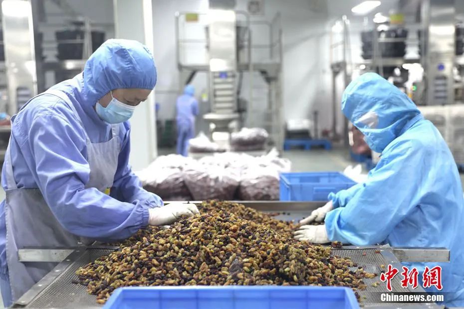 圖為(wei) 工人正在篩選葡萄幹。石芙蓉 攝