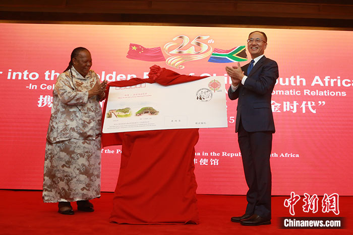 當地時間12月12日,中國駐南非大使館隆重舉(ju) 行慶祝中國和南非建交25周年招待會(hui) 。圖為(wei) 中國駐南非大使陳曉東(dong) 同南非外長潘多爾為(wei) 中南建交25周年紀念封揭幕。 中新社記者 王曦 攝