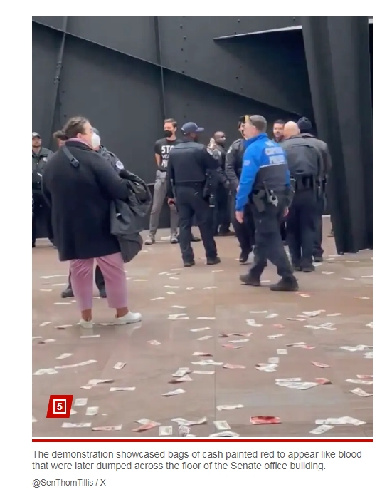 據美國《紐約郵報》報道,在抗議示威活動中,有成袋的美元鈔票被塗上紅色,看上去“血跡斑斑”,並被傾(qing) 倒在大廳的地板上。