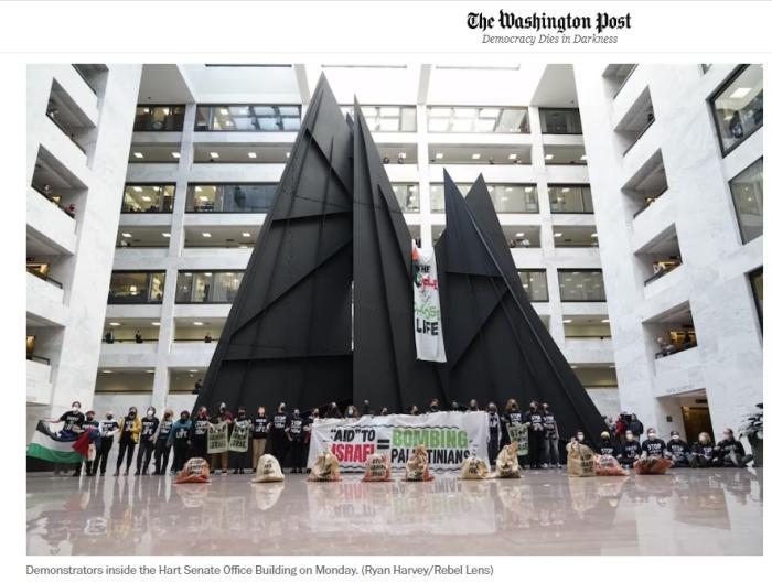 報道稱,抗議者身穿寫(xie) 有“立即停止(援助)武器”字樣的黑色T恤,高喊“立即停火!立即停火!”。他們(men) 還舉(ju) 著寫(xie) 有“援助以色列=轟炸巴勒斯坦人”的條幅。
