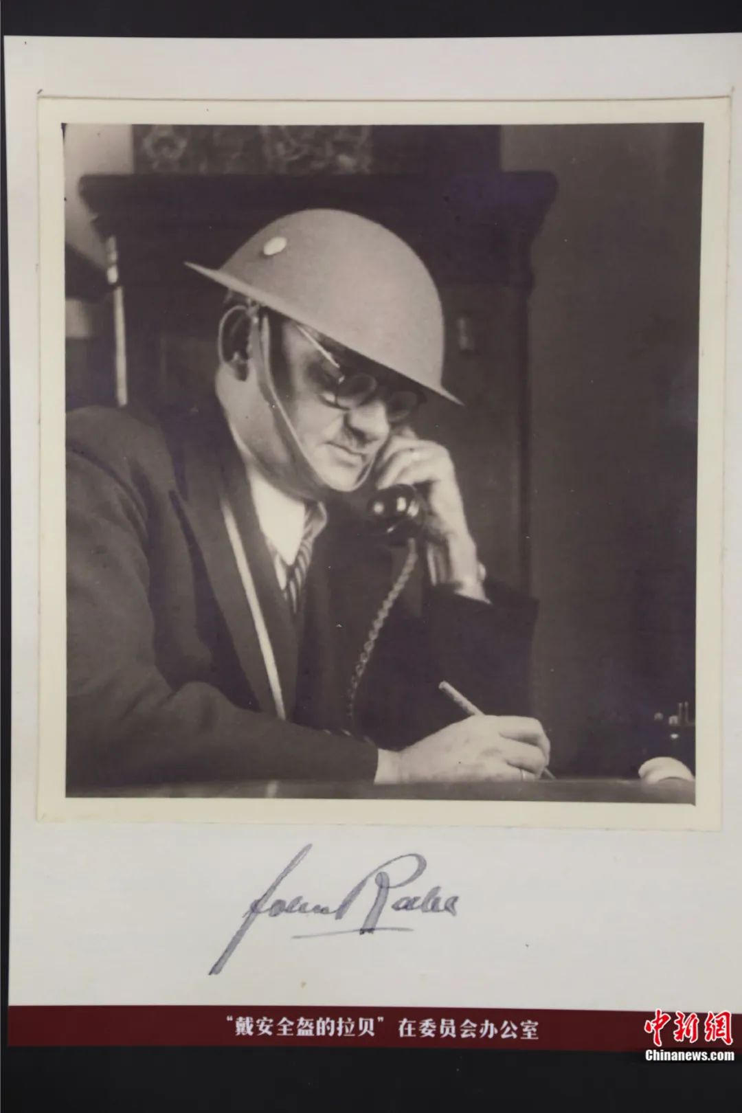 約翰·拉貝北京交流中心展覽上,約翰·拉貝在南京安全委員會(hui) 辦公的資料圖。袁理 攝