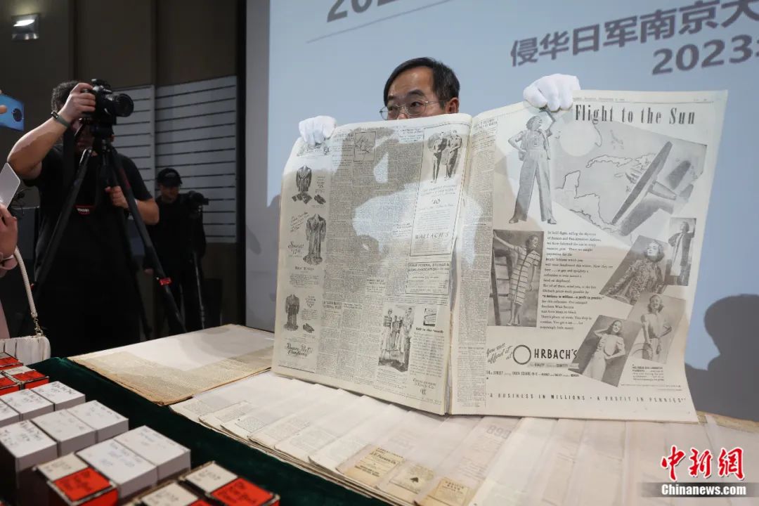 2023年12月8日,侵華日軍(jun) 南京大屠殺遇難同胞紀念館舉(ju) 行2023年新征文物史料新聞發布會(hui) 。美籍華人魯照寧向媒體(ti) 展示1937年12月6日出版的紐約時報,報紙對侵華日軍(jun) 進攻南京做了詳細報道。泱波 攝