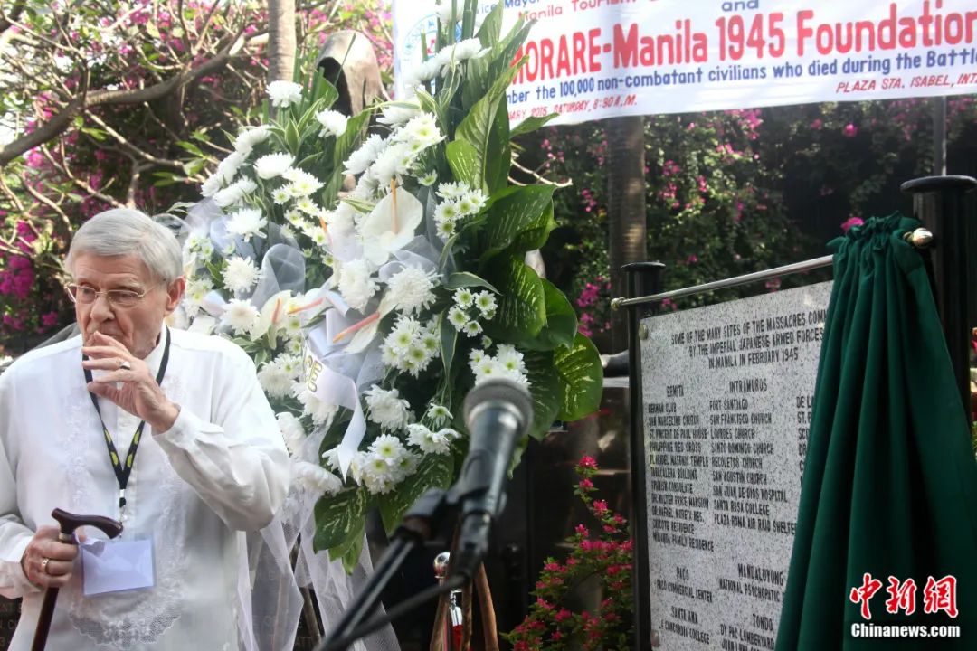 2015年2月14日,菲律賓“銘記馬尼拉1945基金會(hui) ”在馬尼拉舉(ju) 辦活動,紀念馬尼拉戰役70周年。圖為(wei) 與(yu) 會(hui) 人士揭開記載日軍(jun) 在馬尼拉多處實施大屠殺地點的牌匾。張明 攝