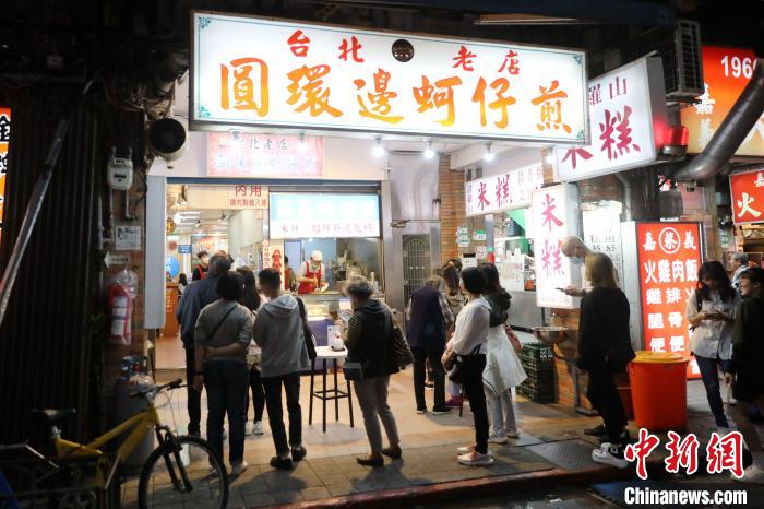 近日,台北寧夏夜市裏的圓環邊蚵仔煎店,顧客在門口排隊。 中新社記者 陳小願 攝