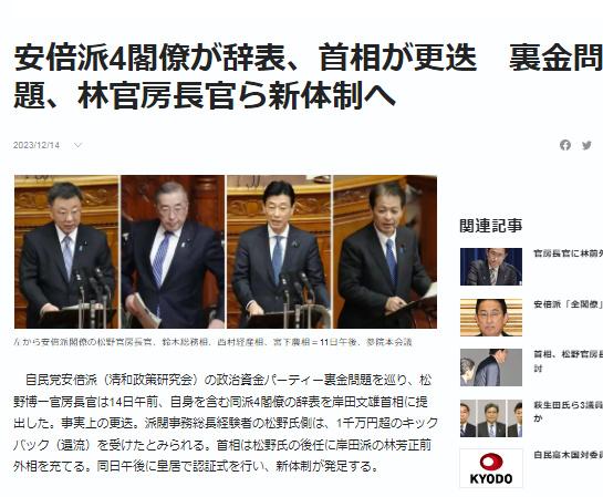 中新網12月14日電 據日本共同社報道,日本自民黨(dang) 安倍派“吃回扣”醜(chou) 聞持續發酵,當地時間14日,多名岸田內(nei) 閣官員提出辭職。