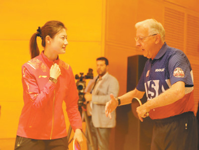 美國乒乓球名宿戴爾·斯威裏斯與(yu) 中國乒乓球名將丁寧在交流球技。
