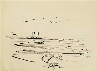 在人物肖像之外,萬(wan) 徒勒裏也熱衷於(yu) 描繪中國山水。他於(yu) 1954年創作的《長江》借鑒了中國水墨丹青技法,整幅畫作視野開闊,體(ti) 現出中國水墨畫的朦朧、婉約與(yu) 詩意。他在客居瑞士期間的畫作同樣展現中國水墨畫開闊的構圖、精巧的線條和獨具一格的東(dong) 方美學。畫作《歸來》通過南飛的歸雁、孤寥的漁船和茫茫無盡的海麵,讓觀者感受到一種難以訴諸語言、始終縈繞心頭的鄉(xiang) 愁。