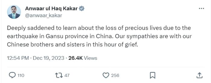 中新網12月19日電 綜合報道,12月18日,甘肅臨(lin) 夏州積石山縣發生6.2級地震。19日,巴基斯坦總理卡卡爾在社交平台上發帖稱,對中國甘肅省地震中失去的寶貴生命深感悲痛。