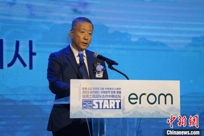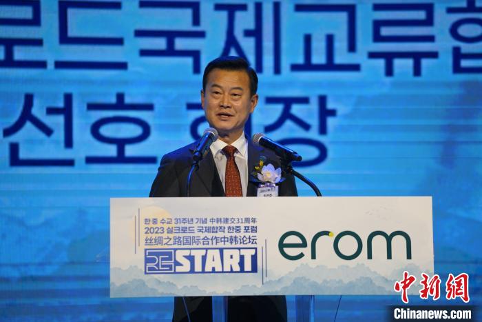 圖為(wei) 韓中絲(si) 綢之路國際交流協會(hui) 會(hui) 長李先虎致辭。中新社記者 劉旭 攝