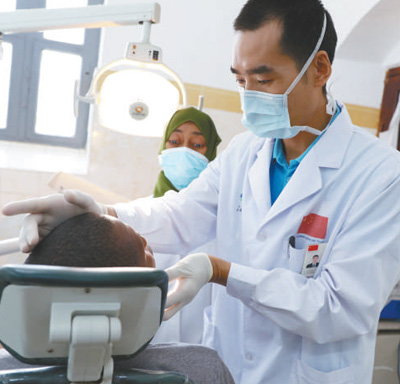 在納茲(zi) 莫加醫院,口腔科醫生盛磊給患者看病。