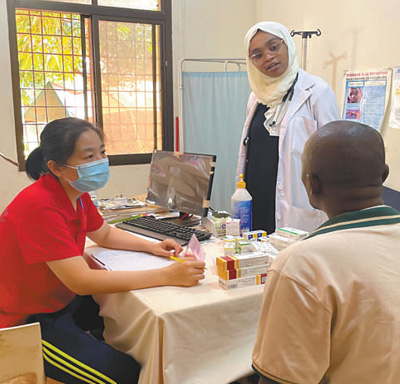 醫療隊在桑給巴爾島開展義(yi) 診,圖為(wei) 內(nei) 科醫生劉翠霞(左一)接診患者。