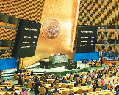 2023年12月12日,聯合國大會(hui) 緊急特別會(hui) 議投票通過決(jue) 議,要求在加沙地帶立即實現人道主義(yi) 停火。圖為(wei) 會(hui) 議投票現場。