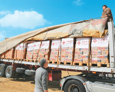 2023年11月27日,在埃及開羅,中國向加沙地帶提供的人道主義(yi) 物資裝車等待發運。