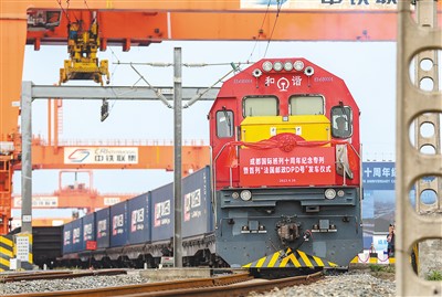 “開行量持續增加、運輸產(chan) 品更加多元、線路不斷豐(feng) 富優(you) 化……從(cong) 中歐班列開行的變化中,可以明顯看出共建‘一帶一路’倡議提出十年來的蓬勃發展。”成都國際鐵路港經開區管委會(hui) 主任雷庭介紹。