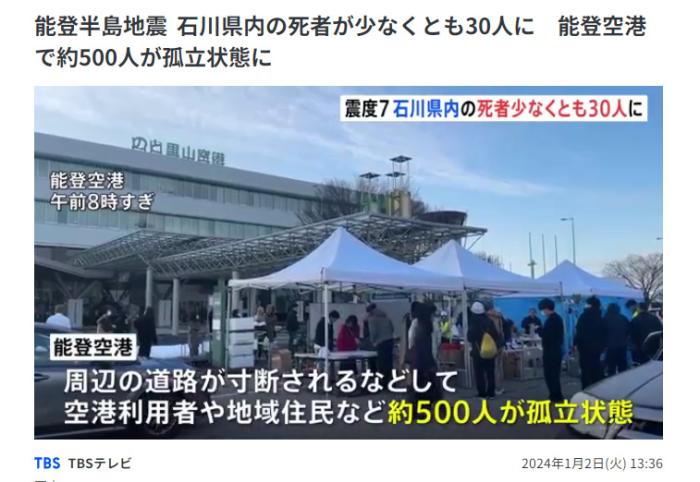據報道,包括機場使用者和當地居民在內(nei) 累計約500人,目前被困於(yu) 輪島市能登機場,周圍道路被切斷。