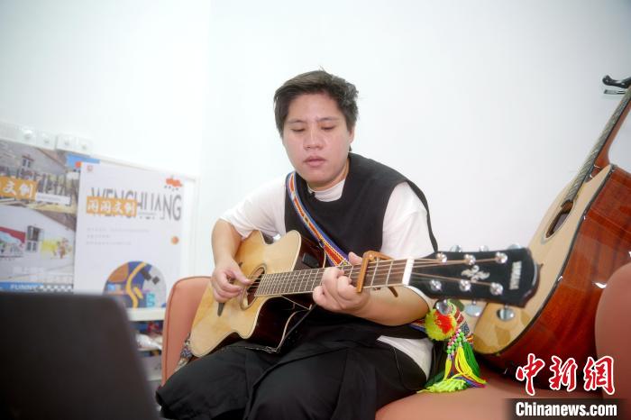 圖為(wei) 賴淑珍邊彈吉他邊哼唱著歌曲《青青之約》。 中新社記者 李思源 攝