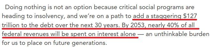 根據該智庫的預測,美國在未來30年將在現有基礎上再增加127萬(wan) 億(yi) 美元債(zhai) 務;到2053年,光是利息成本就要用掉近40%的聯邦財政收入。