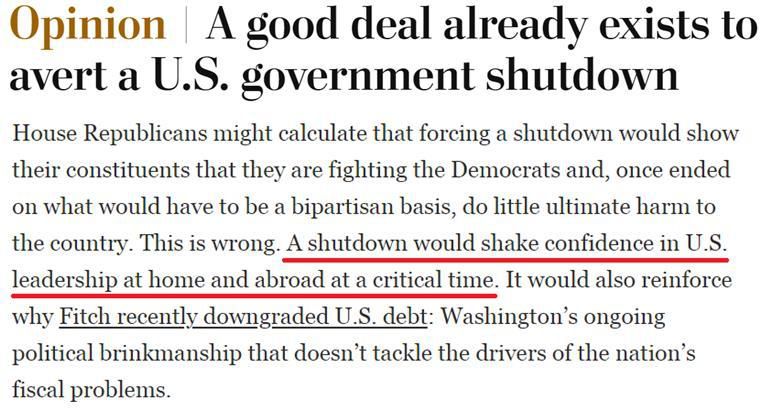 有美媒評論指出,政府關(guan) 門將動搖國內(nei) 外對美國領導層的信心,而這也將進一步坐實國際評級機構對美國信用“降級”的原因:華盛頓持續的政治脅迫政策無法解決(jue) 日益惡化的財政問題。