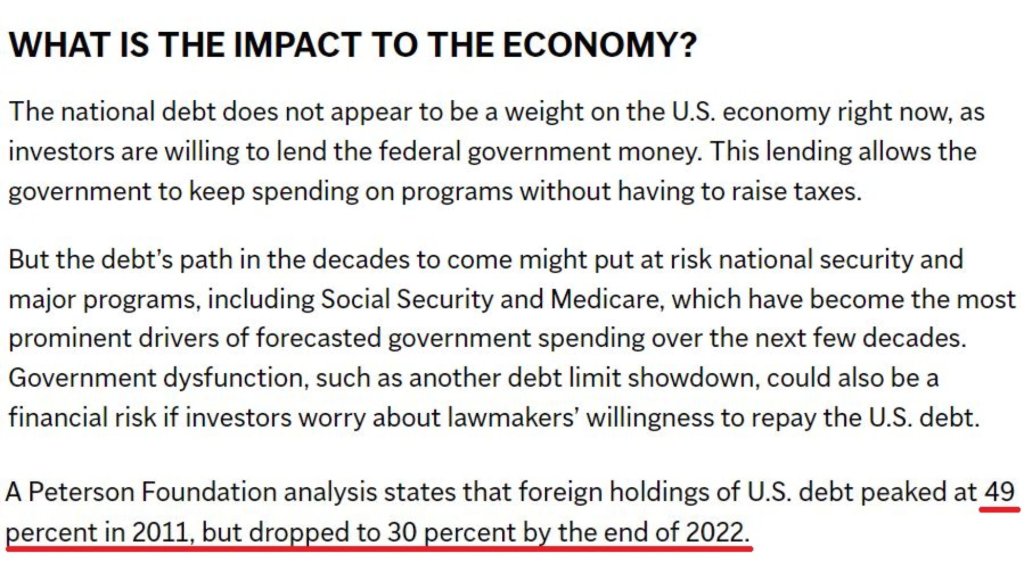 事實上,美國國會(hui) 黨(dang) 爭(zheng) 和政府功能失調引發的多次債(zhai) 務上限之爭(zheng) 和債(zhai) 務違約險情,已迫使國際買(mai) 家紛紛減持美國國債(zhai) 。根據彼得森基金會(hui) 的數據,海外投資者所持美債(zhai) 份額在2011年曾達到49%的峰值,但到2022年底已降至30%。