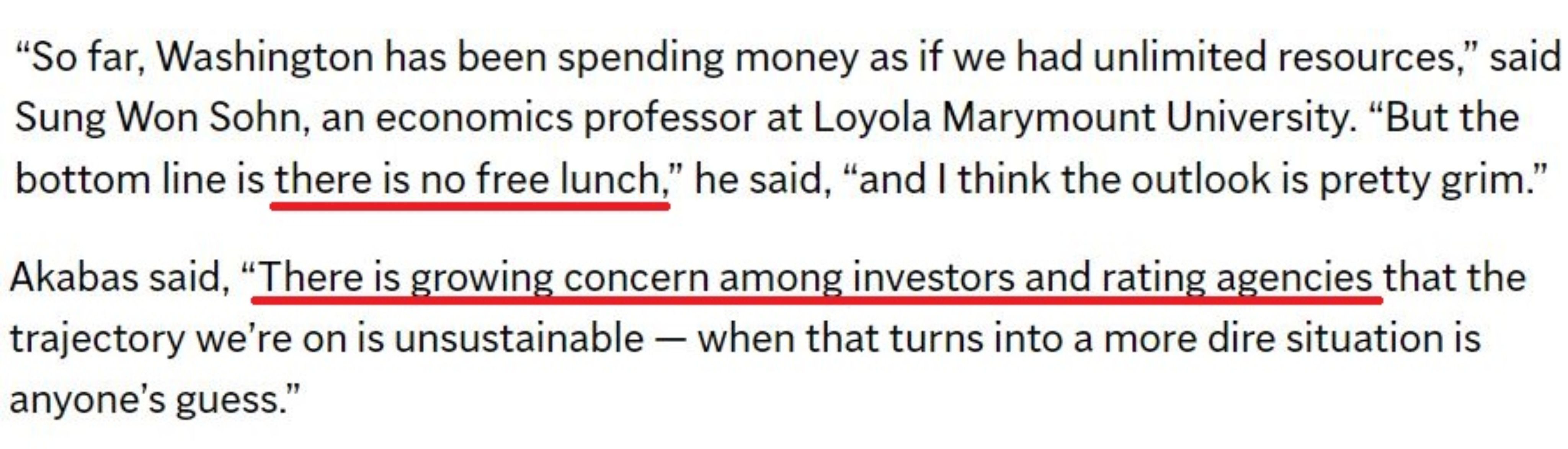 用洛杉磯洛約拉馬利蒙特大學經濟專(zhuan) 家的話說,“到目前為(wei) 止,華盛頓一直在花錢,好像我們(men) 擁有無限的資源,但天下終究沒有免費的午餐”。