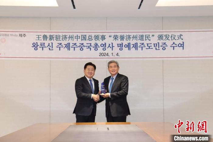 1月4日,韓國濟州道知事吳憐勳(左)向中國駐濟州總領事王魯新頒授“榮譽濟州道民”證書(shu) 。(中國駐濟州總領事館供圖)