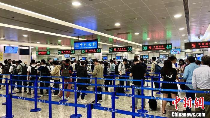 上海浦東(dong) 國際機場邊檢查驗大廳,旅客有序排隊候檢。黃波 攝