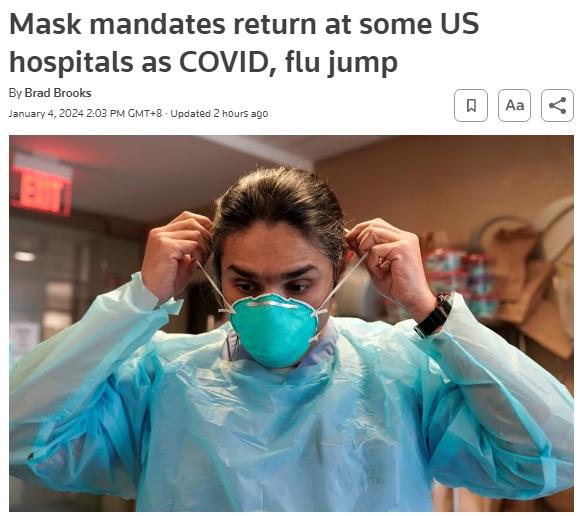 中新網1月4日電 據路透社當地時間3日報道,由於(yu) 新冠病毒和季節性流感等呼吸道疾病病例激增,美國至少有四個(ge) 州的醫院重啟“口罩令”。紐約州、加利福尼亞(ya) 州、伊利諾伊州和馬薩諸塞州的醫療衛生機構恢複要求醫護人員和病患戴口罩的規定。