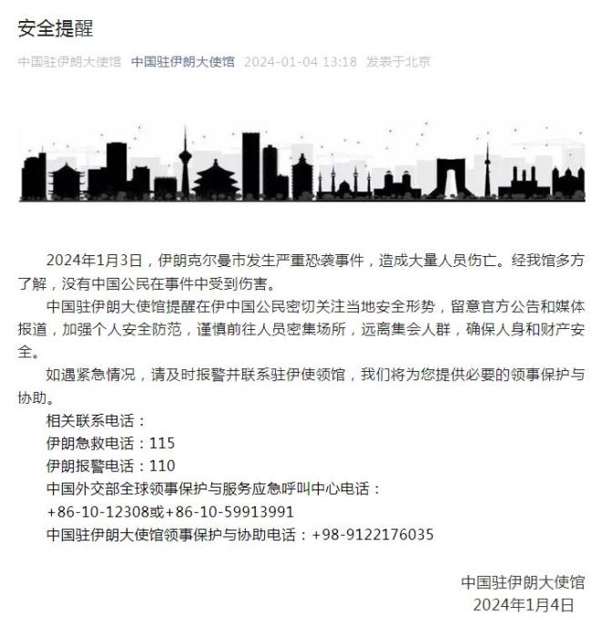 中新網1月4日電 據中國駐伊朗大使館微信公眾(zhong) 號消息,2024年1月3日,伊朗克爾曼市發生嚴(yan) 重恐襲事件,造成大量人員傷(shang) 亡。經大使館多方了解,沒有中國公民在事件中受到傷(shang) 害。