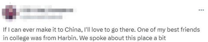 有網友表示,“如果我能去中國,我很想去那裏。我大學時最好的一個(ge) 朋友就是來自哈爾濱。我們(men) 聊過這個(ge) 地方。”