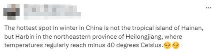 還有網友評論說,“中國冬天最熱的地方,不是海南島,而是黑龍江哈爾濱,盡管那裏的氣溫會(hui) 達到零下40攝氏度。”