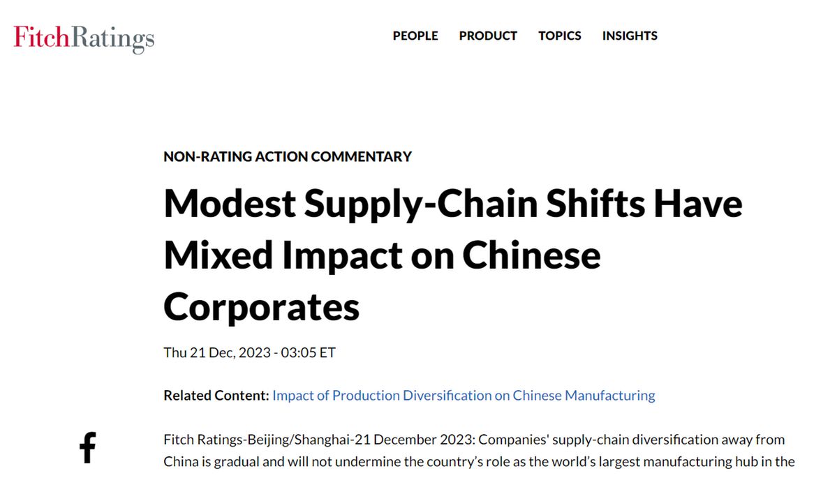 《華爾街日報》的觀察與(yu) 惠譽評級公司最近的一份報告相呼應。該報告稱,在貿易壁壘和地緣政治緊張局勢加劇背景下,全球性企業(ye) 和中資企業(ye) 都在推進供應鏈多元化。不過,產(chan) 能外遷規模仍然有限,且集中在低技能的組裝和量產(chan) 領域,如紡織、服裝和鞋類。