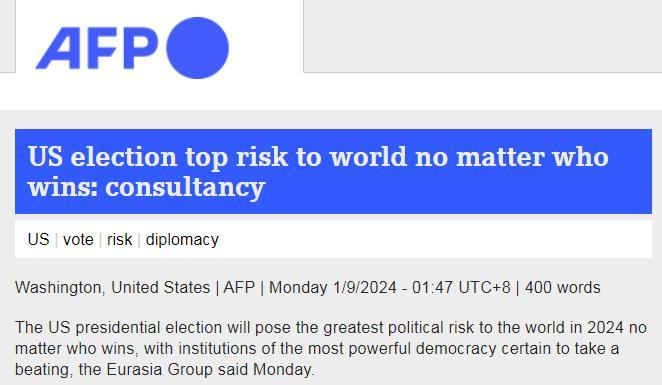 中新網1月10日電 據法新社報道,日前,政治風險谘詢公司歐亞(ya) 集團表示,無論誰獲勝,2024年美國總統選舉(ju) 都將給世界帶來最大政治風險,美國製度將會(hui) 受到打擊。