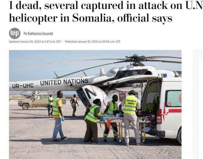 中新網1月11日電 美國《華盛頓郵報》援引消息人士稱,當地時間10日,聯合國一架直升機因故緊急迫降在加爾古杜德州後,被索馬裏“青年黨(dang) ”劫持。