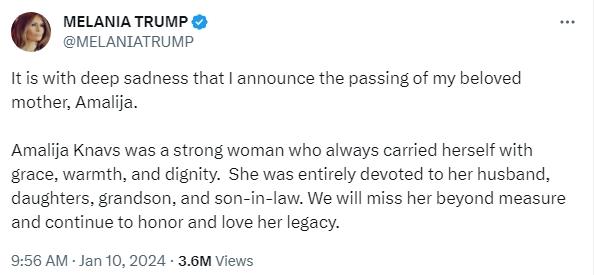 梅拉尼婭在X平台上發文稱,“我懷著沉痛的心情宣布,我深愛的母親(qin) 阿瑪利加去世了。阿瑪利加·納夫斯是一名堅強的女性,她總是舉(ju) 止優(you) 雅、溫暖、莊重。”她寫(xie) 道,“她深深地愛著她的丈夫、女兒(er) 、外孫和女婿。我們(men) 會(hui) 無比地懷念她,也會(hui) 繼續尊重和愛戴她留下的寶貴財富。”