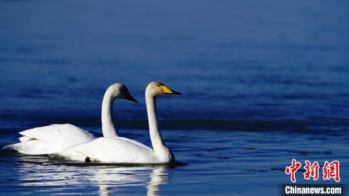 資料圖:天鵝在青海省海西州巴音河上遊弋。 巴圖納生 攝