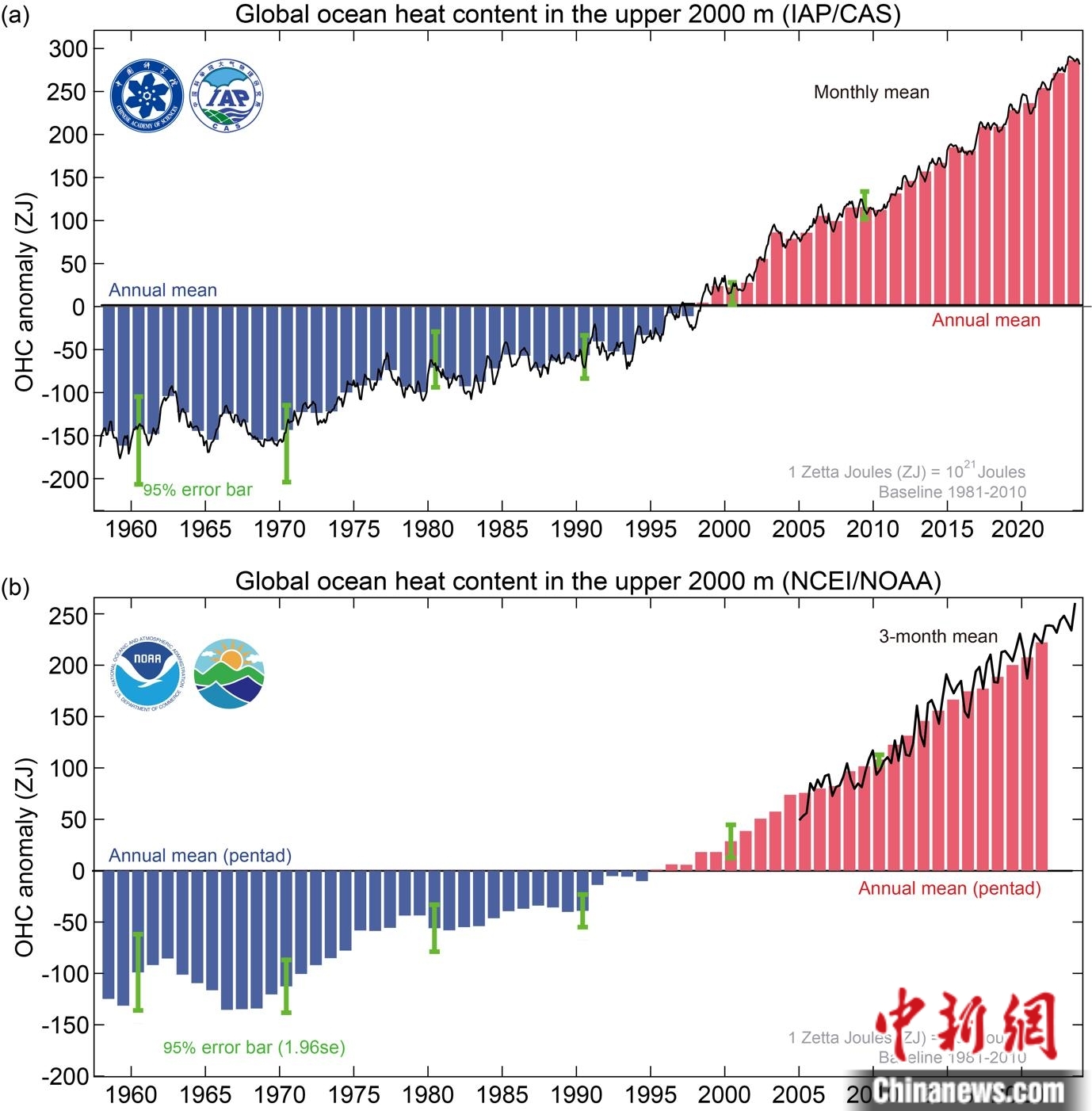 1958-2023年全球海洋上層2000米熱含量變化時間序列:上圖為(wei) IAP/CAS數據;下圖為(wei) NOAA/NCEI數據。中國科學院大氣物理研究所/供圖